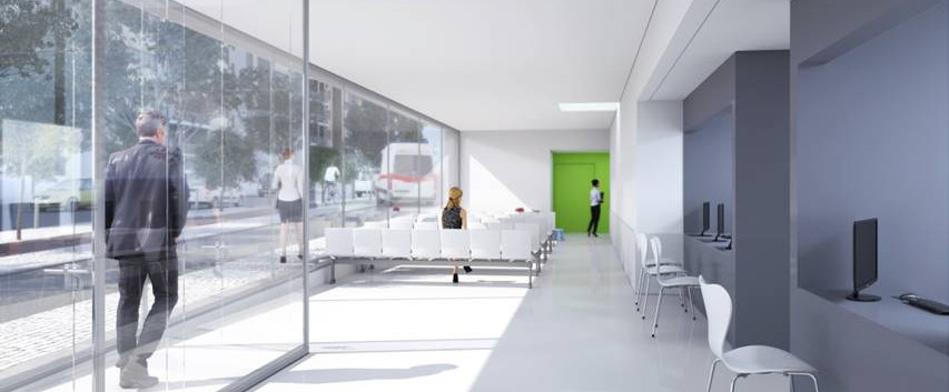 Toda a frente do edifício será formalizada com as salas de espera, cujas fachadas são desenhadas de uma forma aberta, pública e comunicativa.