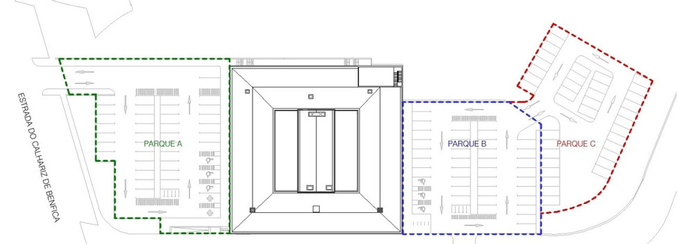 Serão criadas duas zonas de estacionamento - Parque A, acedida pela estrada do Calhariz de Benfica e Parque B, acedida através da Rua Tenente Coronel Ribeiro dos Reis.